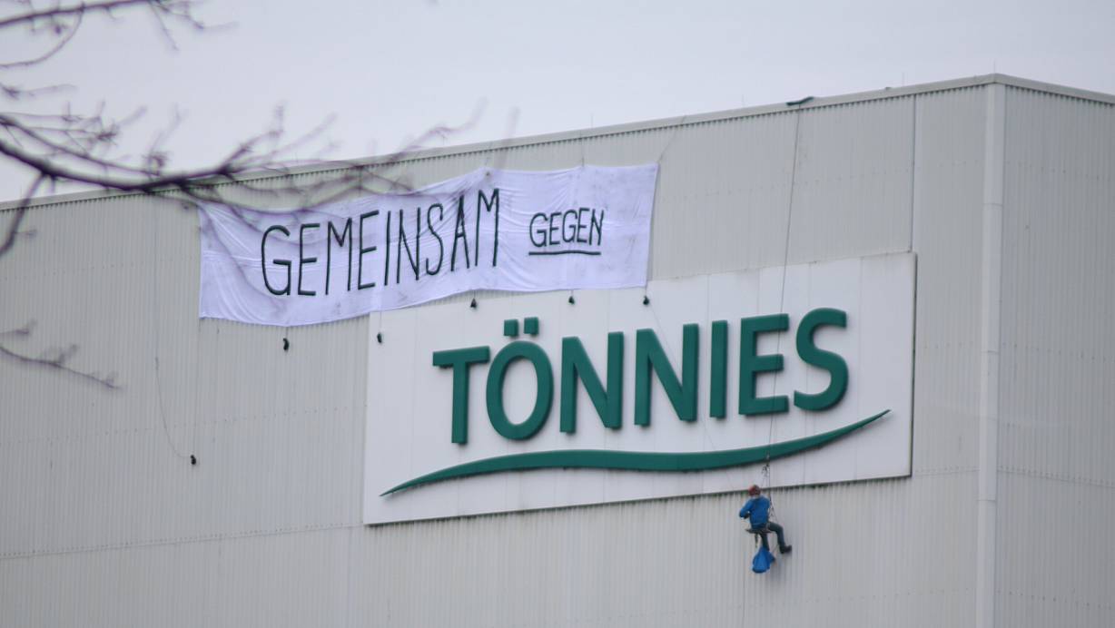 Demonstranten des Bündnisses „Gemeinsam gegen die Tierindustrie“ protestierten am Donnerstag mit mehreren Aktionen auf und vor dem Gelände des Tönnies-Hauptsitzes in Rheda-Wiedenbrück.