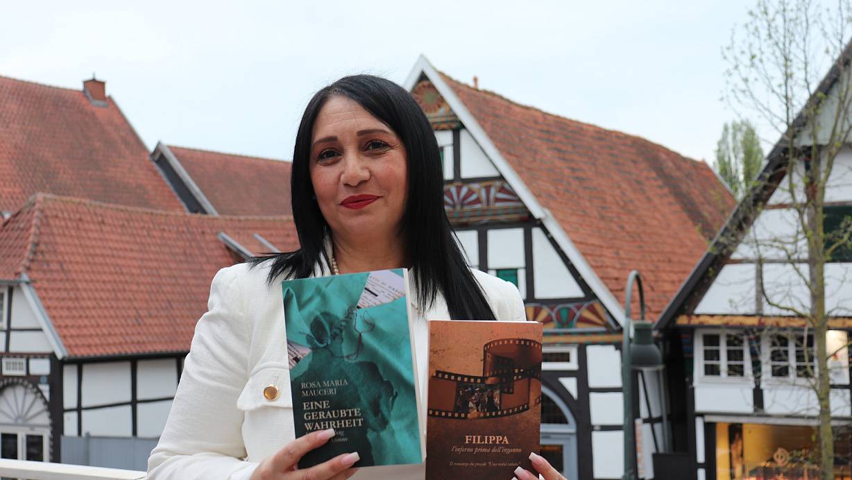 Rosa Maria Mauceri präsentiert ihre beiden Bücher auf der Terrasse des Ratskellers. An ihrem dritten Buch arbeitet die Frau, die seit kurzem in Rheda-Wiedenbrück lebt. | © Marion Pokorra