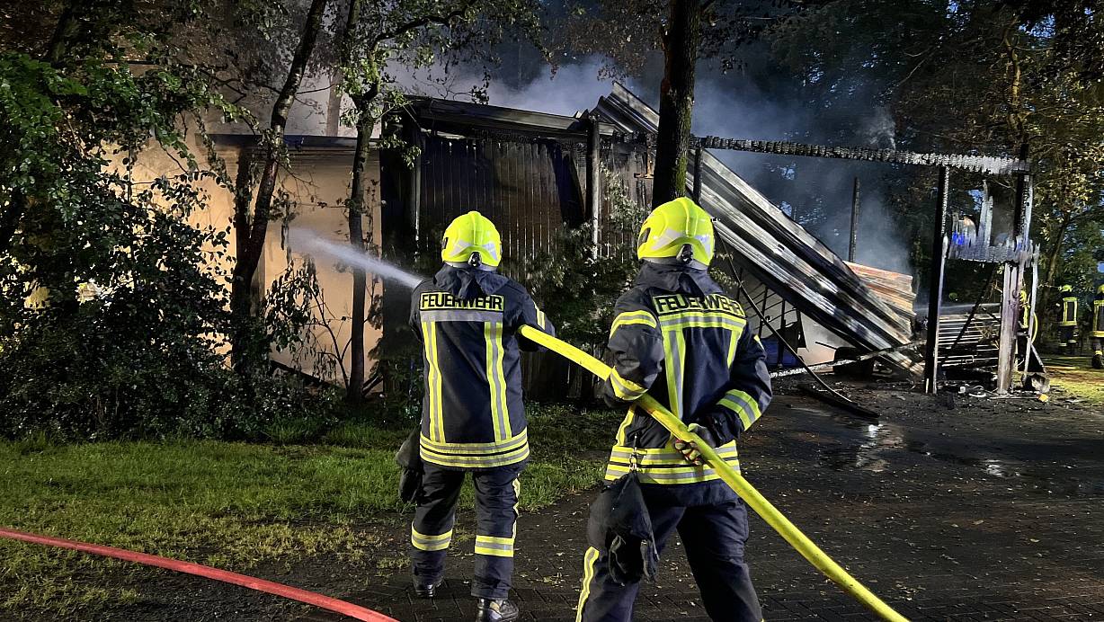 Eine Scheune war am Dienstagabend in Rheda-Wiedenbrück in Brand geraten. Der Einsatz zieht sich bis in die Nacht hinein.