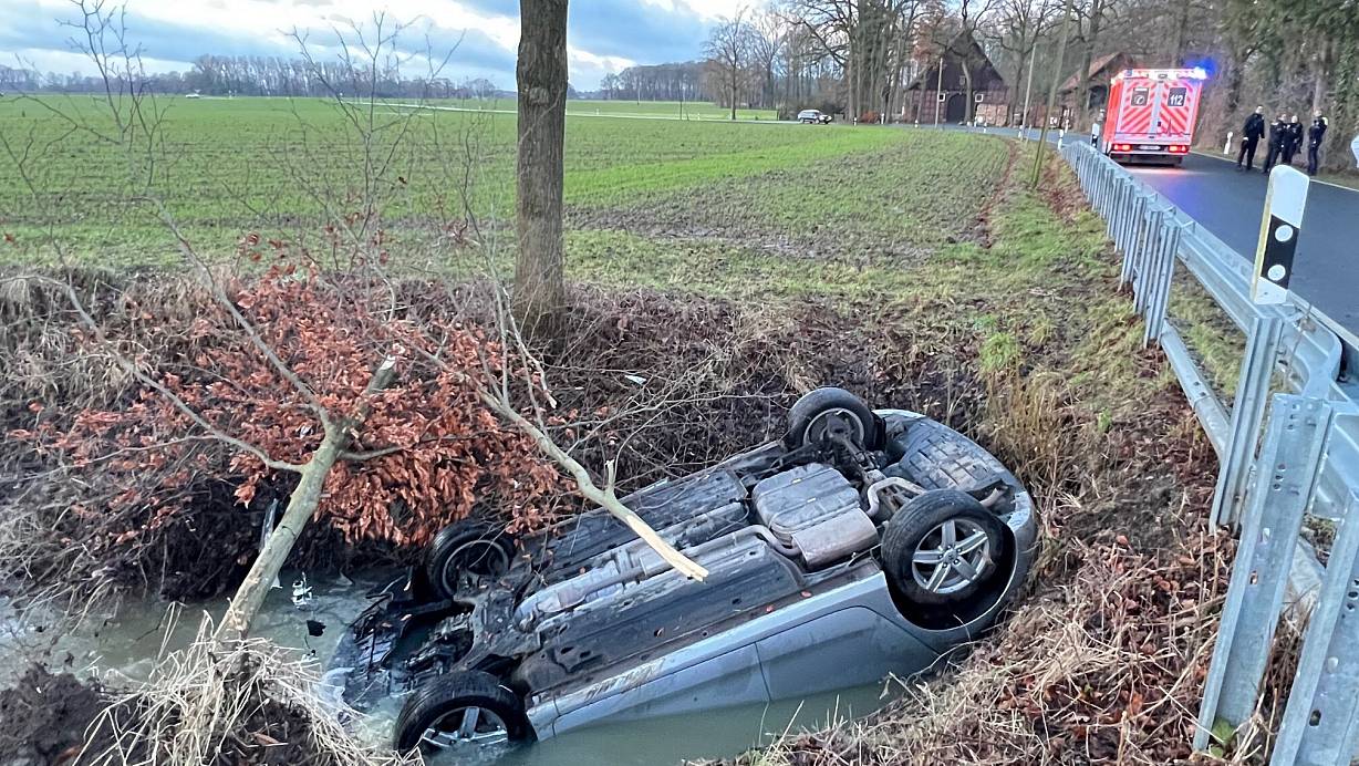 Auf glatter Straße: Autofahrer aus Kreis Gütersloh überschlägt sich und landet im Wasser