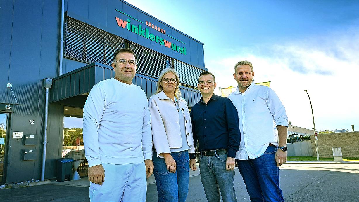 Klaus und Teresa Winkler (v.l.) haben ihr Unternehmen Winklerswurst an Tom Krassselt und Daniel Vlasak verkauft. Die neuen Chefs übernehmen ab dem 1. Oktober die Leitung des Betriebs. | © Andreas Frücht