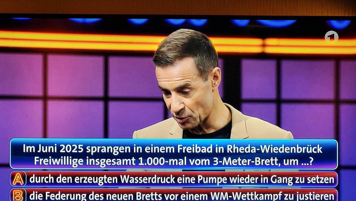 In der am Mittwochabend ausgestrahlten Folge waren Ex-Schauspieler und Bodybuilder Ralf Moeller und Schauspieler Henning Baum am Start. In der Kategorie „Schlagzeilen“ wollte Kai Pflaume vom Team Hoëcker/Moeller wissen: „Im Juni 2025 sprangen in einem Freibad in Rheda-Wiedenbrück Freiwillige insgesamt 1.000-mal vom 3-Meter-Brett, weil...?“