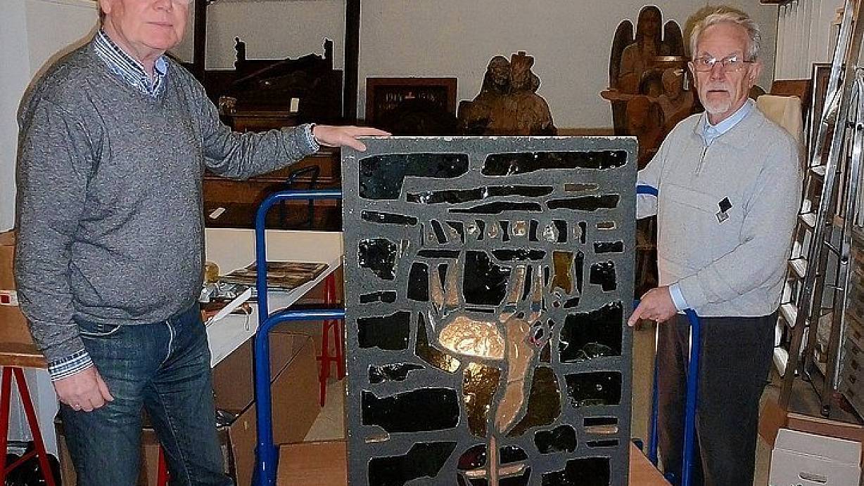 Ein auch materiell besonders wertvolles Exponat ist ein Originalfenster aus hartem Material mit einem Kunstwerk aus Glasstücken darin. Es wartet auf eine adäquate Konstruktion, um es im Wiedenrbrücker Schule Museum ausstellen zu können.