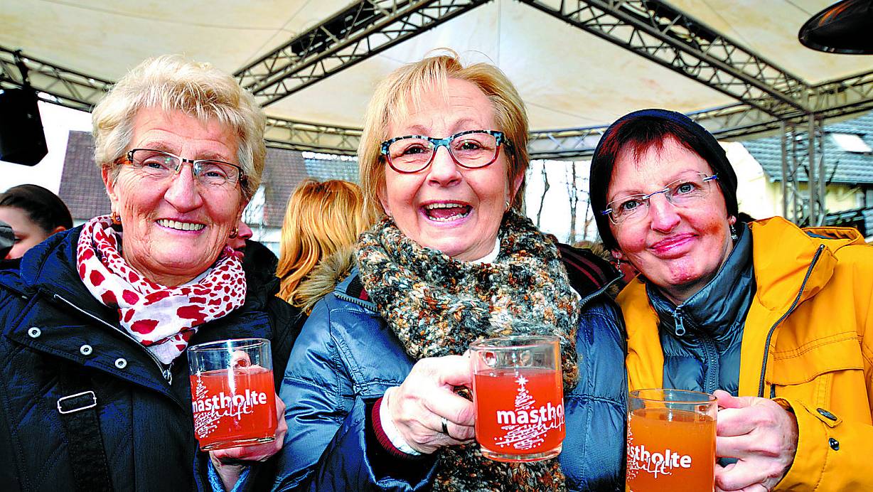 Bestens aufgelegt: Doris Wulberg (v.l.), Elisabeth Landmann und Waltraud Werner genießen den gelungenen Tag auf dem Parkplatz am Hotel Adelmann. Aus eigenen "Mastholte hilft"-Gläsern schmeckt der Punsch noch mal so gut. | © Birgit Vredenburg