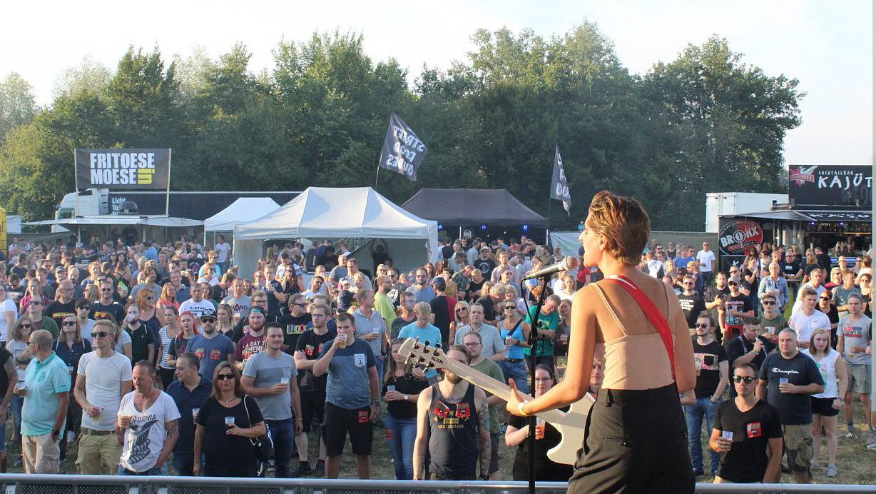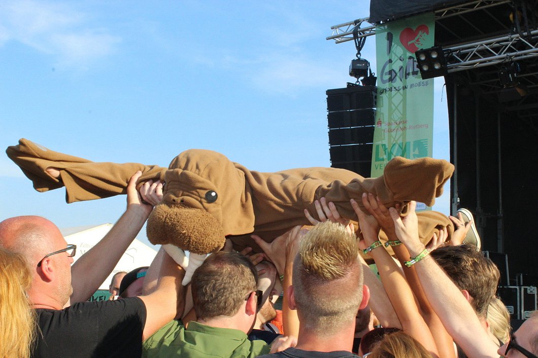 Nachdem die ersten Rockfans schon das Tanzbein schwangen, sorgte die "Destination Anywhere" mit ihrem wilden Punkrock und extravaganten Showeinlagen für ausgelassene Stimmung auf dem immer voller werdendem Festivalgelände. Die acht Jungs aus dem Siegerland machten mit Posaune, Saxophon, Trompete und ihrem beliebten Maskottchen, Seelöwe Walter, ordentlich Dampf und sind seit Jahren eine gern gesehene Festivalband mit großer Anhängerschaft.