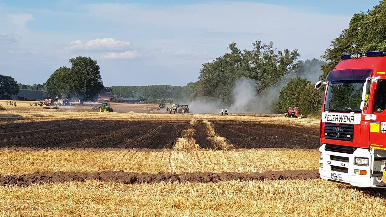 Durch die anhaltende Trockenheit und leichte Windböen hat sich das Feuer auch auf dem bereits abgeernteten Acker ausgebreitet. Etwa 90 Prozent des Feldes standen in Flammen.