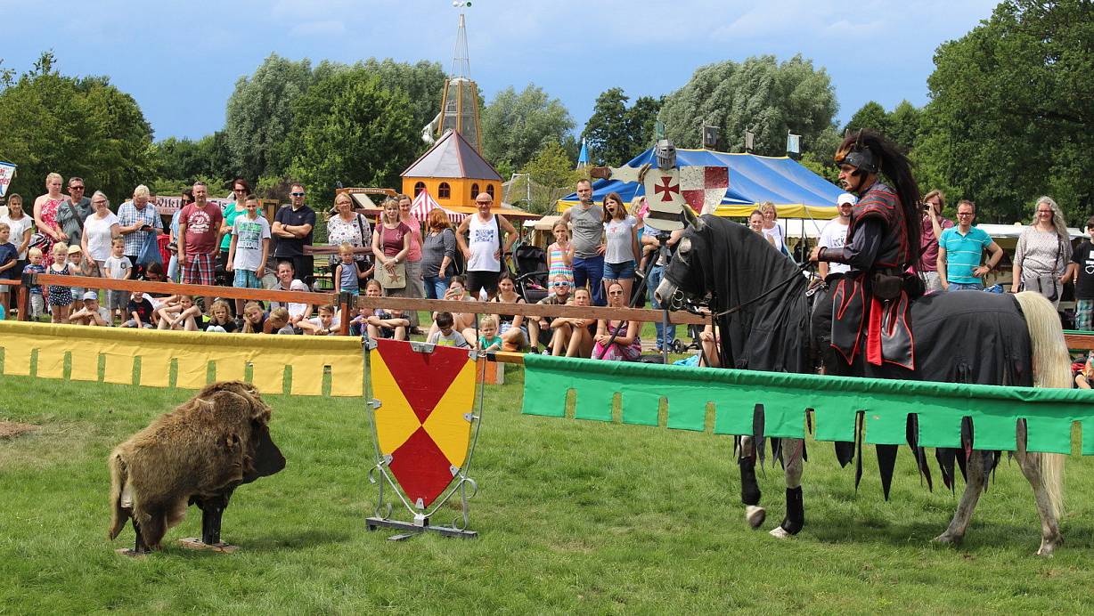 Höhepunkt der gesamten drei Tage waren die Ritterturniere, die insgesamt fünf Mal ausgetragen wurden. „König Ludwig und seine Frau Elisabeth sind von ihrer Reise nicht zurückgekehrt", erzählt Stefan Kaiser dem Publikum die Vorgeschichte zu Ritterturnier, ehe der 24-jährige Mastholter die vier Ritter anspornt, das Turnier für sich zu entscheiden: „Es kann nur einen Sieger geben, der neuer Herrscher über das Land wird."