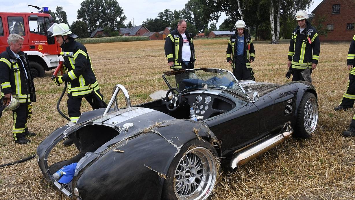 DerSportwagen schleuderte nach rechts von der Straße und landete schließlich auf einem abgeernteten Getreidefeld, wo er auf den Reifen stehen blieb. Zuvor war durch die Wucht eines Aufpralls unter anderem das linke Hinterrad aus der Verankerung gerissen worden, sein Leben hat der Fahrer nach Ansicht der Feuerwehrleute wohl dem montierten Überrollbügel zu verdanken.