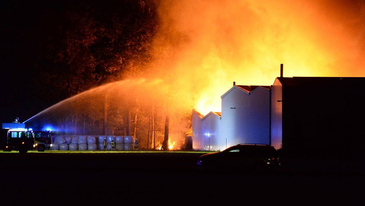 Die Flammen waren weit sichtbar, die Feuerwehr mit 200 Kräften im Einsatz. In der Nacht zu Freitag ist in Mastholte eine Halle von einem Feuer zerstört worden.