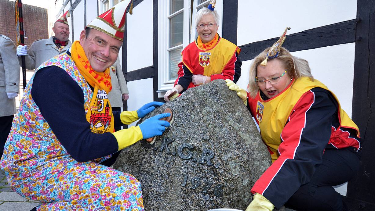 Eingespieltes Team: Bürgermeister Andreas Sunder und die Altweiber Birgit Boldt (r.) und Marianne Bartscher schrubben den Stein der Weisen in diesem Jahr besonders gründlich. | © Birgit Vredenburg