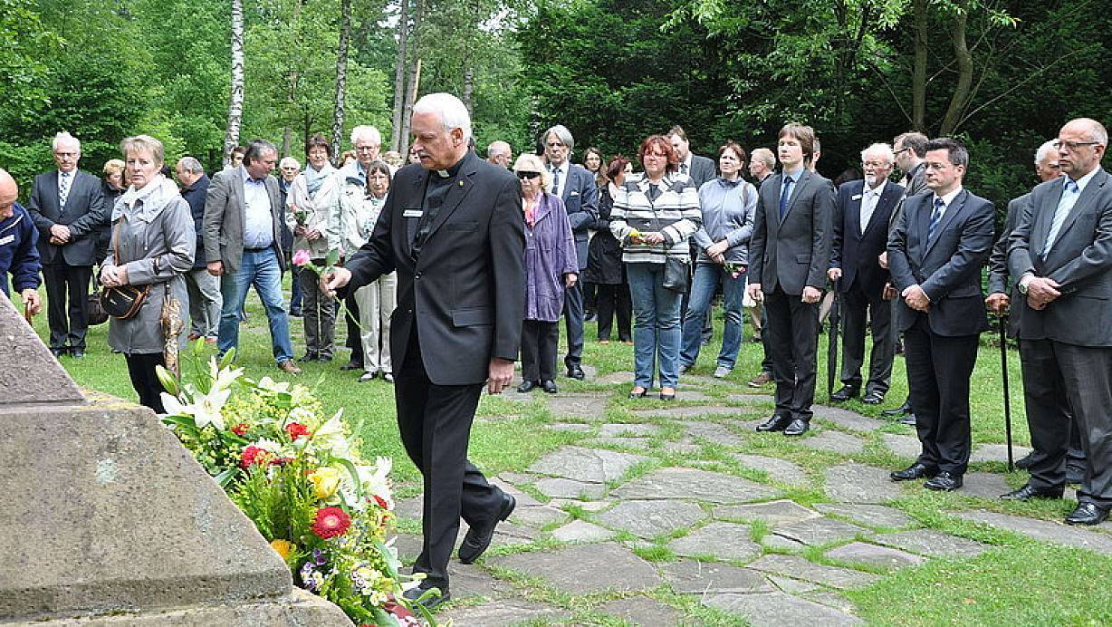 Nach dem langen Kampf um Anerkennung ist die Finanzierung der Stalag-Arbeit das zentrales Thema. Derzeit zahlt das Land einen jährlichen Zuschuss von 12.500 Euro, Kreis und Stadt je 8.000 Euro. "Sie müssen aber jedes Jahr neu beantragt werden", betonte Büngener. Vereinbarung sei: "Solange das Land zahlt, zahlen wir auch." Büngener und auch der stellvertretende Bürgermeister Hans Schäfer setzten sich für eine höhere und verlässlichere Unterstützung des Landes ein. Viele Besucher legten Blumen und Kränze am Obelisken nieder. Unter ihnen war Ferdinand Matuszek. Im Dezember 1944 war vor seinen Augen ein Gefangener ermordet worden. Die Recherchen des Stalag ergaben, dass dieser Mann mit Namen Ponomorow auf dem Ehrenfriedhof in der Reihe E begraben liegt.