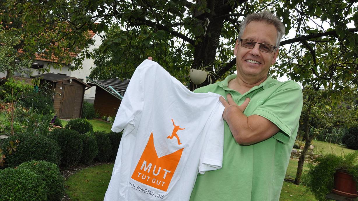 Mut tut gut: Werner Scheips zeigt das T-Shirt mit dem Motto für den Kolpingtag 2015. Der 54-jährige Maschinenbautechniker ist seit Mitte der 90er Jahre Vorsitzender der Kolpingfamilie St. Ursula. | © Karin Prignitz