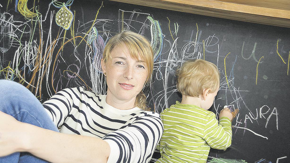 Maltalent: Jennifer Sieweke mit ihrem fast zwei Jahre alten Sohn Oskar, der seine Kreativität unter anderem auf einer großen Tafel ausleben kann. Die 37-jährige Grafik-Designerin schafft es, Beruf und Kindererziehung miteinander zu vereinen. | © Karin Prignitz