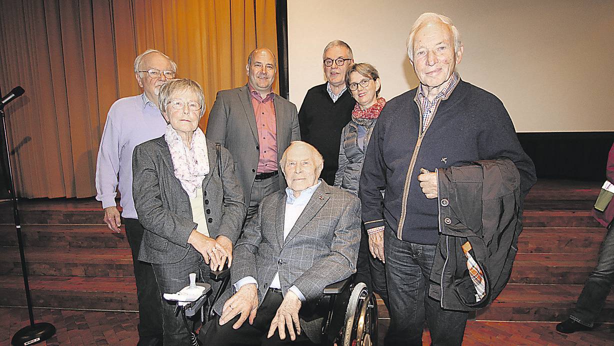 Nach der Filmpremiere: Manfred Büngener (Vorsitzender des Fördervereins der Dokustätte, v. l.), Zeitzeugin Lisa Dirkschnieder, Bürgermeister Hubert Erichlandwehr, Werner Busch als Kämpfer für die Dokustätte und Film-Mittelpunkt, die Filmemacher Michael und Maria Hallau sowie Zeitzeuge Ferdinand Kaiser. | © Sabine Kubendorff