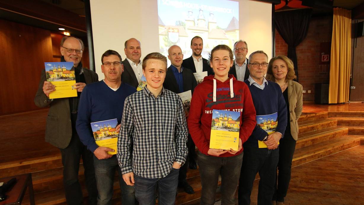 Hartmut Lüdeling (v. l.; ARGE Dorfentwicklung), Ulf Gansauge (Stukenbrock-Senne), Bürgermeister Hubert Erichlandwehr, Maximilian Anselm (Liemke), Carsten Lottner (DSK), Mario Pohle (DSK), David Brokherm (Liemke), Werner Thorwesten, Reinhold Brinkmann (Sende) und Silke Sykora bei der Abschlussveranstaltung IKEK | © Birgit Guhlke