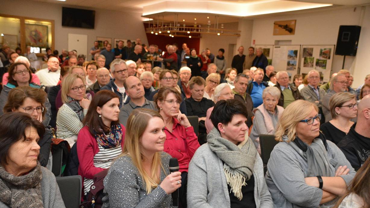 Viele Fragen: Die Halle der St.-Achatius-Schützen ist voll besetzt. Nach den Impulsreferaten haben die Bürger Gelegenheit, ihre Anliegen loszuwerden. Hier hält Lena Neuwöhner das Mikrophon in der Hand. | © Karin Prignitz