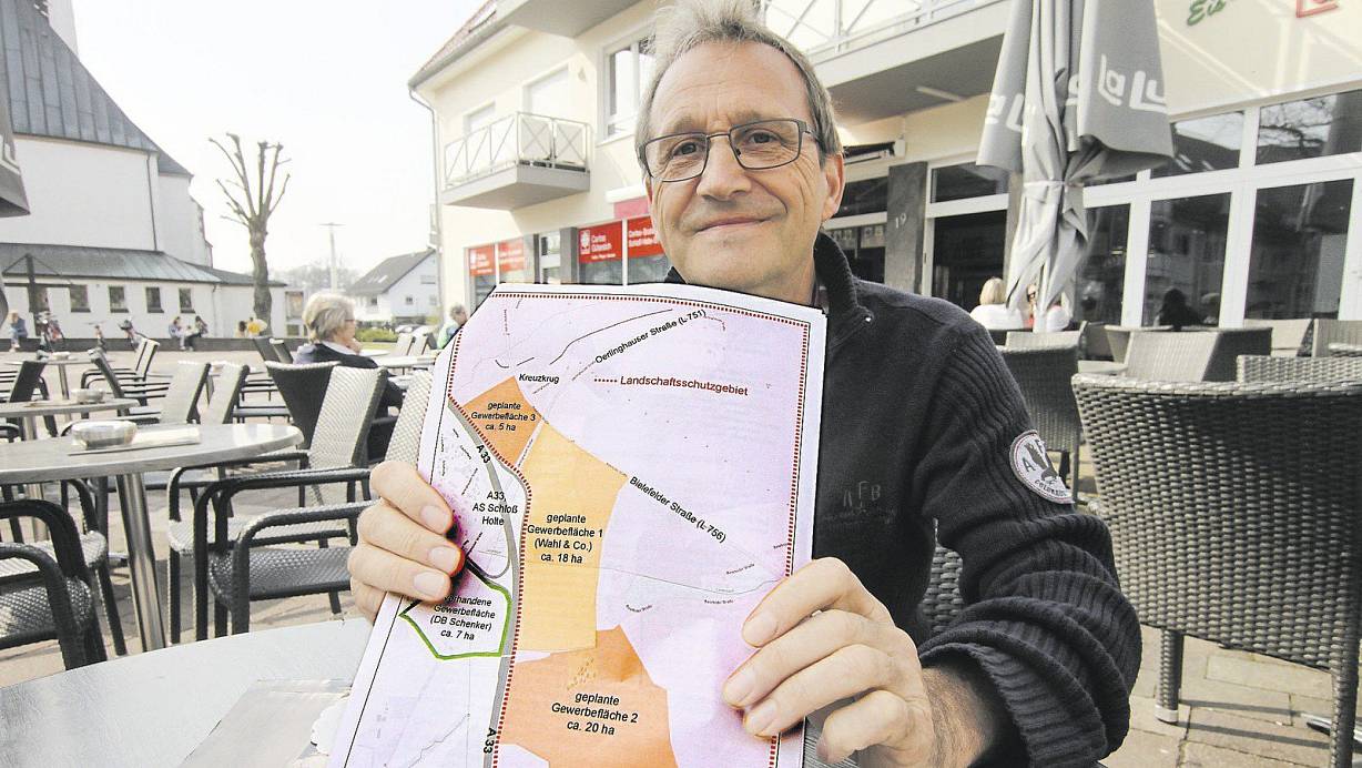 Flächenverbrauch: Uwe Domres zeigt seine Karte, auf der drei mögliche Gewerbeflächen eingezeichnet sind – Gesamtgröße 43 Hektar. 18 davon beansprucht der Logistiker Wahl & Co. | © Sabine Kubendorff
