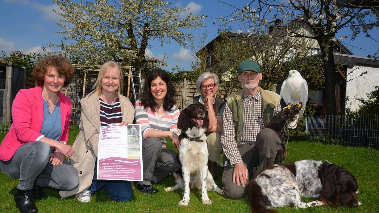 Laden ein: Imke Heidotting von der Stadt (v. l.), Kerstin Raeder und Julia Makhardt vom Kreisfamilienzentrum, Bianca Meetz vom Hegering Schloß Holte-Stukenbrock sowie Falkner Ulrich Klose mit Gerfalke Melina und seinen Hunden, den Kleinen Münsterländern Baroness und Aron. Fotos: Karin Prignitz | © Karin Prignitz