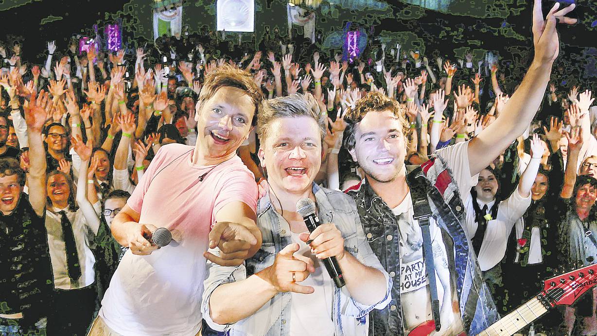 Partystimmung: Die Dorfrocker und Brüder Markus (v. l.), Tobias und Philipp Thomann vor dem feiernden Publikum im vollen Festzelt der Schützenbruderschaft. | © Kristoffer Fillies