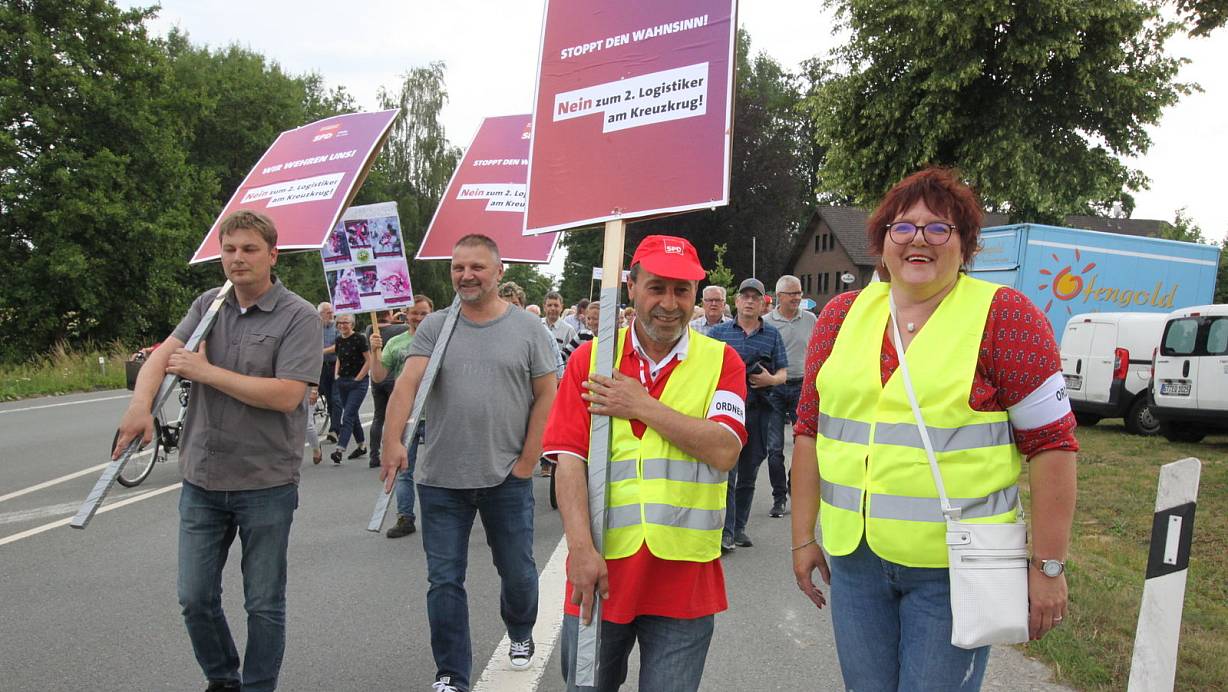 Protestmarsch: Die SPD mit Marion Herzog und Metin Eser (2. v. r.) an der Spitze hat dazu aufgerufen, gegen die Ansiedlung des Logistikers Wahl & Co. am Kreuzkrug zu demonstrieren. | © Sabine Kubendorff