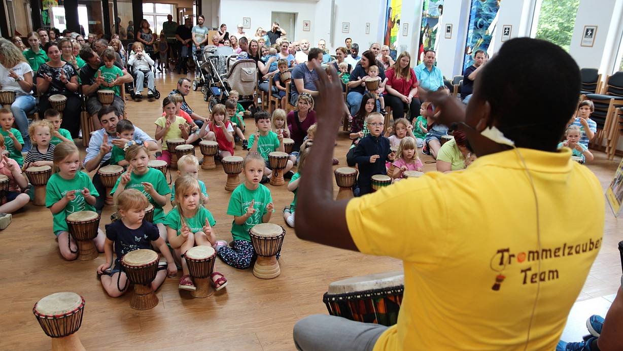 Mit Trommelschlägen, Pantomime und Gesang eröffnet das Team „Trommelzauber" die Geburtstagsfeier der Kita und zugleich das Gemeindefest. | © Knut Dinter