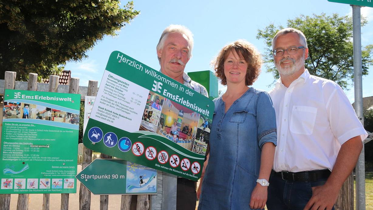 Neues Hinweisschild: Albert Brock vom städtischen Bauhof (l.) bringt die neuen Schilder an. Sie sind bedeutend größer als bisher und entsprechen den Ergebnissen des Vergleichs vor Gericht. Imke Heidotting und Martin Venne von der Stadtverwaltung möchten den Charakter der Ems-Erlebniswelt unbedingt erhalten, wollen aber auch das Ruhebedürfnis der Nachbarn ernst nehmen. | © Knut Dinter
