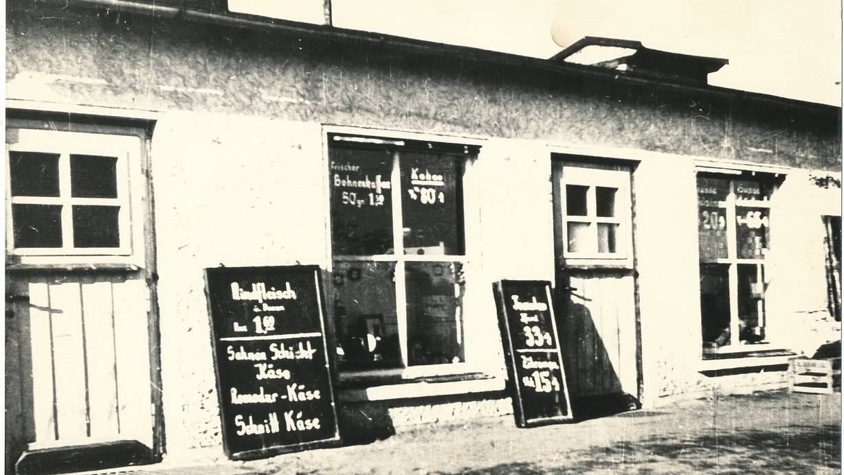 Blick zurück: Auf diesem Foto aus den 50er Jahren sind die Werbeflächen des Geschäftes in der ehemaligen Arrestbaracke (heute Gedenkstätte) zu sehen. Das Bild zeigt, dass zu der Zeit der Blick nach vorn wichtig gewesen ist. Ziel war es, sich eine neue Heimat aufzubauen und das vorgefundene so gut wie möglich zu nutzen. | © Archiv Stalag 326