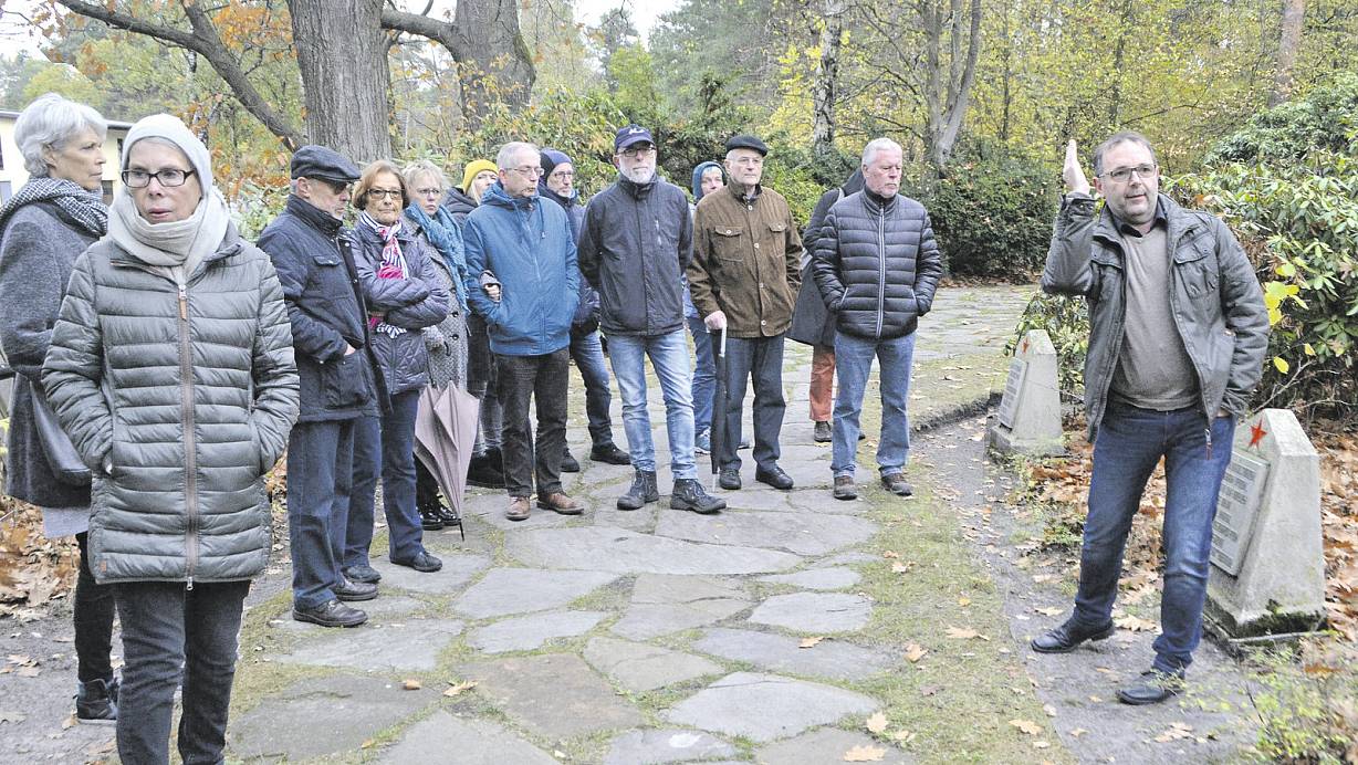 Der Geschäftsführer der Gedenkstätte Stalag 326 erläutert den ein Dutzend Teilnehmern zunächst das Lager, in dem es bei der Ankunft der ersten Kriegsgefangenen keinerlei Infrastruktur zur Unterbringung gab. Wie die als „slawische Untermenschen“ deklassierten Häftlinge in Laubhütten hausten und Baumrinde aßen, konnten sich anfangs noch die Bewohner der Senne anschauen. „Doch als die Gestapo merkte, dass die Menschen vor dem Zaun Mitleid hatten, wurde das eingestellt.“ So starben die oft sehr jungen gefangenen Rotarmisten in Scharen. An Unterernährung, Seuchen, TBC. „Sie wurden auch gefoltert und ermordet“, betont Nickel. Von hier aus wurden sie in Arbeitskommandos dem Ruhrbergbau, der Landwirtschaft, der Möbelindustrie zugeteilt und dort mit Glück besser behandelt und ernährt, damit sie überhaupt arbeiten konnten.