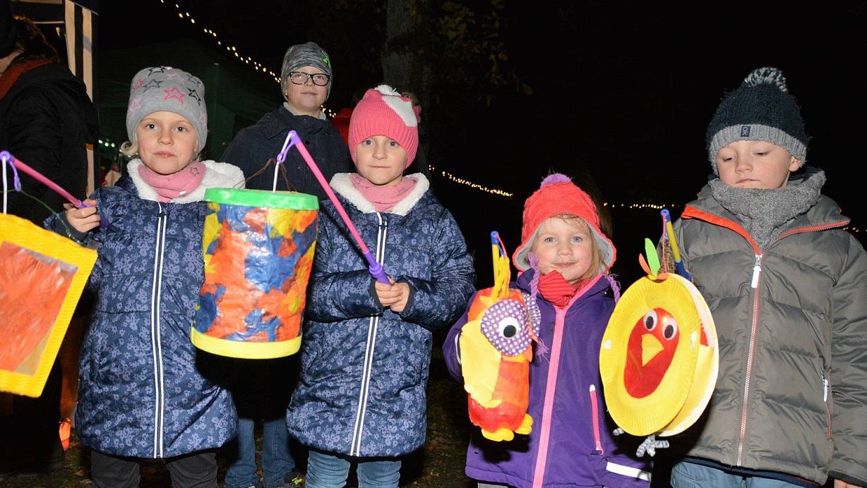 Bunte Laternen: Livia, Louisa, Heidi und Oskar (v. l.) haben am Martinsumzug teilgenommen. Insgesamt rund 300 Kinder und Eltern waren nach Schätzungen der Veranstalter dabei, als sich der Zug, angeführt von St. Martin (Nicole Schubert auf ihrem Pferd) auf dem Platz in Bewegung gesetzt hat. | © Karin Prignitz