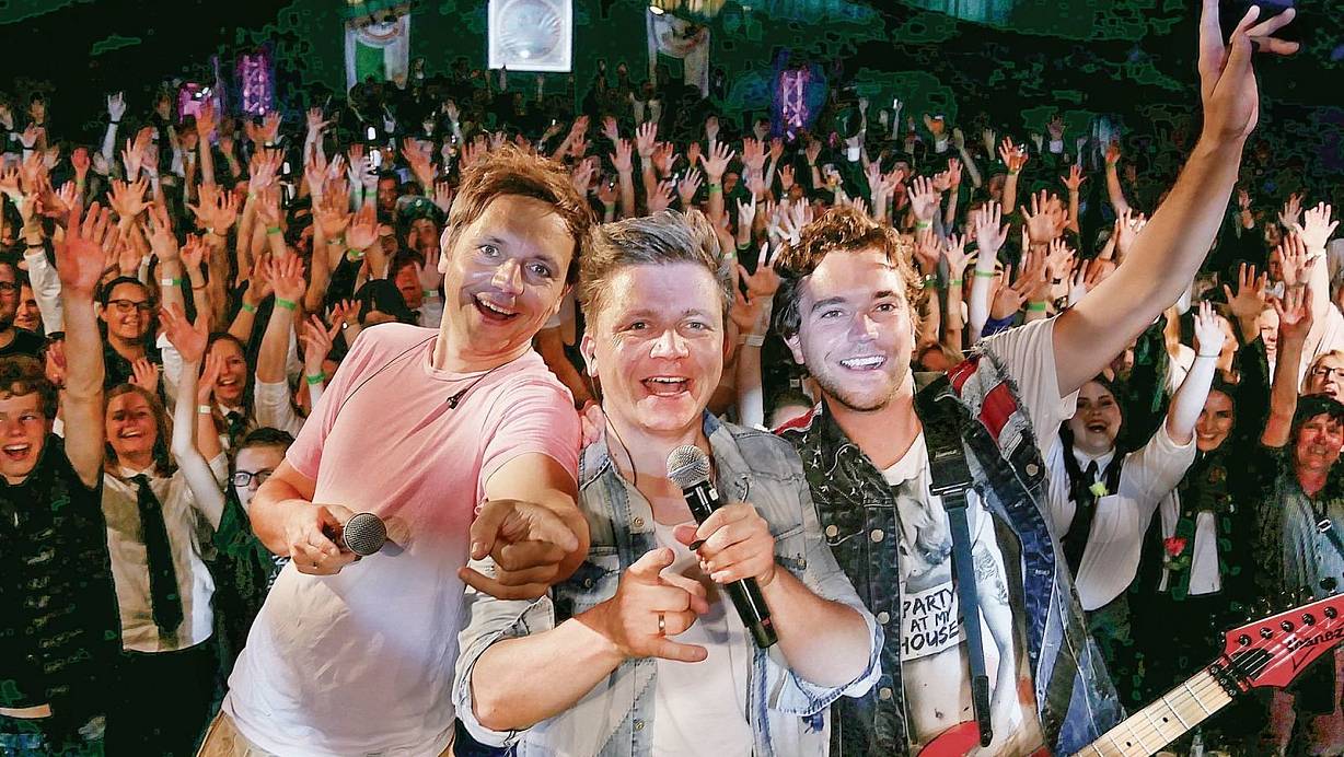 Der erste Auftritt: Die Dorfrocker und Brüder Markus (v. l.), Tobias und Philipp Thomann im Mai vor dem feiernden Publikum im vollen Festzelt in Stukenbrock-Senne. | © Kristoffer Fillies