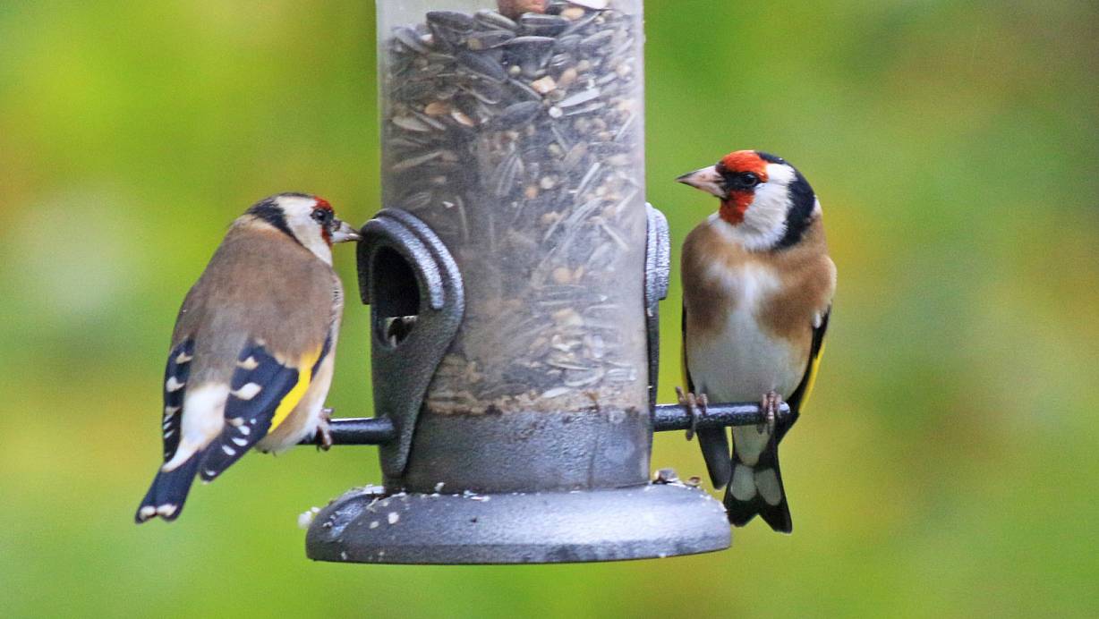Am Vogelfuttersilo: Zwei Stieglitze bedienen sich an Samen und Körnern. Das Ehepaar Vorwerk hat schon lange keinen Stieglitz mehr im eigenen Garten gesehen. Die letzte Sichtung hatten sie vor etwa vier Jahren. | © Martin Düsterberg