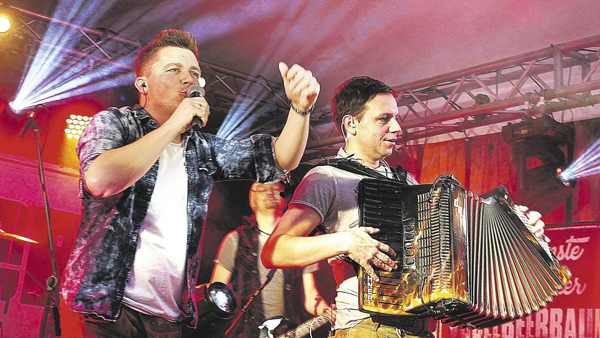 Party im Schützenhaus: Sänger Tobias Thomann und Akkordeonspieler Markus Thomann tragen bayrische Lederhosen und sorgen für mächtig Stimmung in Stukenbrock-Senne. | © Kristoffer Fillies