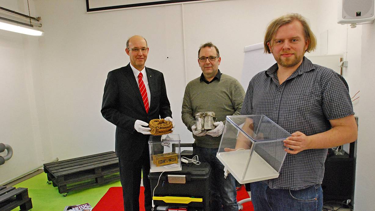 Startklar: Werner Twent (v. l.), Vorstandsmitglied der Stiftung der Ktreissparkasse Wiedenbrück und Vorstand der Kreissparkasse Wiedenbrück, schaut sich in der ehemaligen Entlausungsstation an, wozu Oliver Nickel und Jens Hecker die Spende verwendet haben. | © Gunter Held