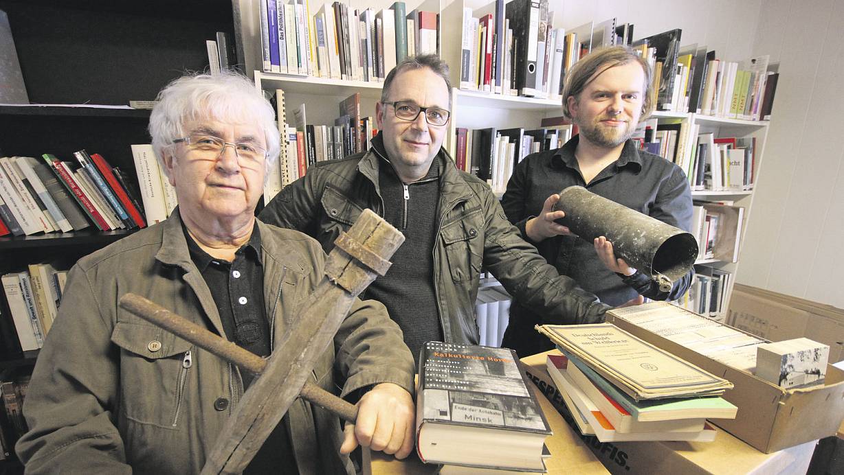 Wertvoller Archivschatz: Günter Potthoff (v. l.) überreicht Oliver Nickel und Jens Hecker unter anderem einen Handbohrer, Bücher, Postkarten und eine umfunktionierte Geschosshülse. Die Bücher müssen jetzt in die Regale einsortiert werden. | © Sigurd Gringel