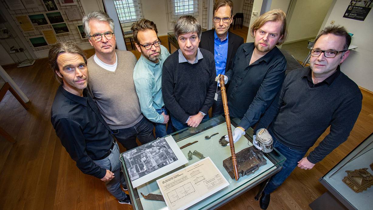 Blicken zurück, planen die Zukunft: Die Wissenschaftler Andreas Neuwöhner (Verein für Geschichte und Alterstumskunde Westfalen, v. l.), Marcus Weidner (LWL-Internet-Portal „Westfälische Geschichte"), Malte Thießen (LWL-Insitut für westfälische Regionalgeschichte), Burkhard Beyer (Historische Kommission für Westfalen), Peter Fäßler (Uni Paderborn), Jens Hecker und Oliver Nickel (beide Gedenkstätte Stalag 326). Hecker zeigt ein zukünftiges Ausstellungsstück, einen Handstock, den ein Stalag-Gefangener für einen Schloß Holter als Erinnerungstück geschnitzt hat, der versehrt den Russland-Feldzug überlebt hatte. Er stammt aus der Sammlung von Günter Potthoff. | © 2019 Mike-Dennis Mueller