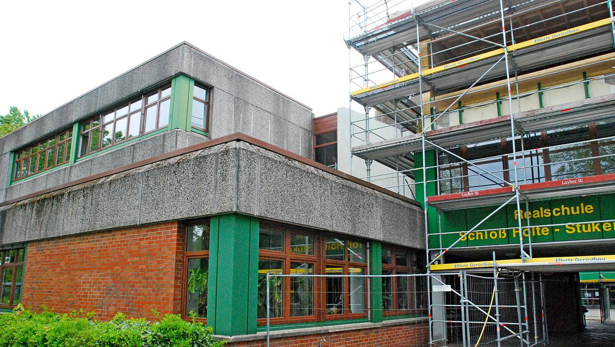 Abgerockte Fassade: Bei der Sanierung des Realschulgebäudes für die Gesamtschule wird demnächst auch das Äußere aufgehübscht – zunächst einmal nur das, was von der Holter Straße aus zu sehen ist. Die Rückfront bleibt vorerst unberücksichtigt. Jetzt stellt sich die Frage, ob der Aula-Block, der bislang nicht auf der Maßnahmen-Liste steht, auch eine neue Fassade bekommen soll. | © Gunter Held