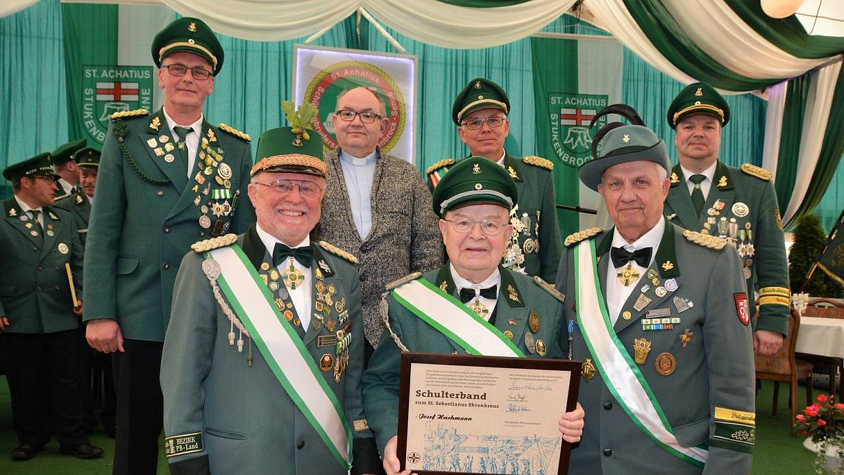 Besondere Ehre: Josef Hachmann (81) bekommt vom stellvertretenden Bezirksbundesmeister Meinolf Fleitmann (l.) und Diözesanbundesmeister Eberhard Banneyer (r.) das Schulterband zum St. Sebastianus-Ehrenkreuz und die entsprechende Urkunde verliehen. Hinter ihnen stehen Oberst Karl-Heinz Deppe (v. l.), Pfarrer Karl-Josef Auris, König Hermann-Josef Brummelte und Brudermeister Frank Hachmann. | © Karin Prignitz