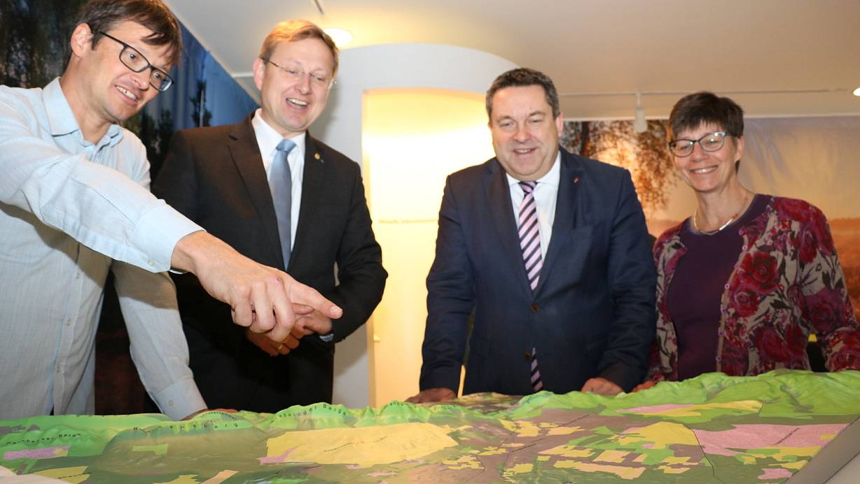 Überblick: Der Projektleiter des Naturschutzgroßprojektes Senne und Teutoburger Wald, Daniel Lühr (l.), deutet auf die Stelle, an der der Furlbachpfad lang führen wird. Augustdorfs Bürgermeister Andreas Wulf (2. v. l.), Landrat Axel Lehmann und die Vorsitzende des Naturparks, Birgit Hübner, bestaunen die topografische Karte des Senne-Gebietes. | © Till Sadlowski