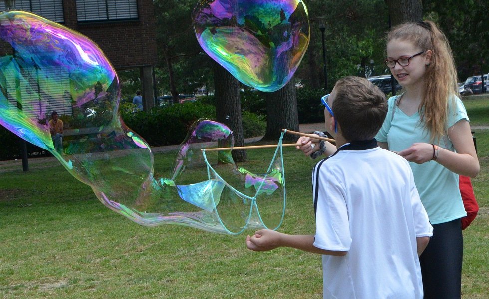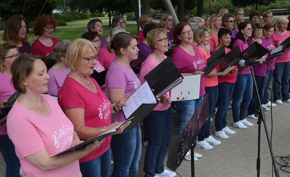 „Lass die Sonne in dein Herz“, sangen die stimmgewaltigen Frauen von „Lady Dur“, und das war nicht schwer angesichts des schönen Wetters und der zahlreichen Angebote. An die drei Dutzend selbst gebackene Torten sorgten für die Qual der Wahl und die Kinder freuten sich über Pfeilwerfen auf Luftballons, Kinderschminken, Knuddelbälle und Anstecker basteln, schillernde große Seifenblasen, Nägel mit Hammer treffen und Dosenwerfen. Popcorn, Eis und Gummibärchen rundeten das Angebot ab.