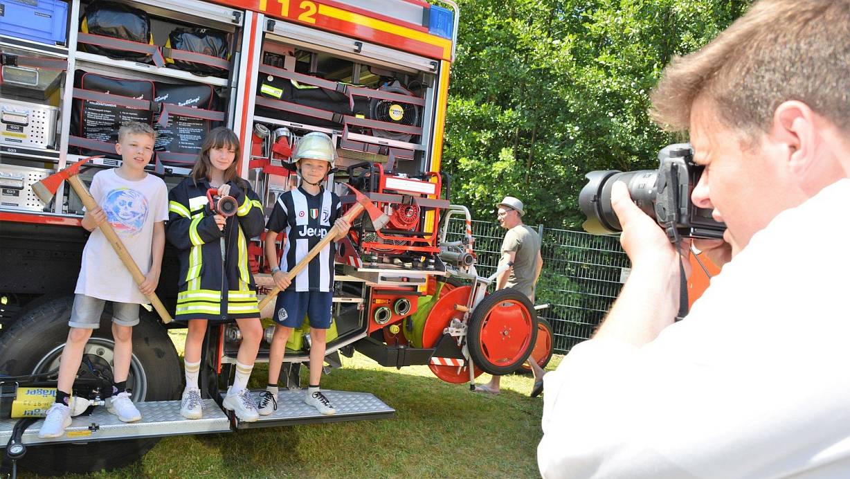 Eingefangen: Felix Hano (r.) fotografiert Ben Brink (11), Emma Klausing (11) und Silas Steinbeck (12, v. l.) vor einem Feuerwehrauto mit Gerätschaften, Jacke und Helm. Beim Feuerwehrfest dürfen die Kinder in die Rollen der Kameraden schlüpfen. | © Karin Prignitz