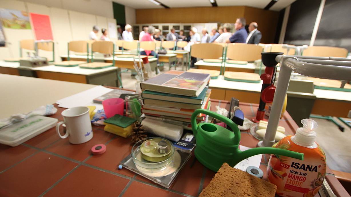 Chemieraum: Die Mitglieder des Bildungsausschusses (im Hintergrund) überzeugen sich davon, dass nach 40 Jahren Neuerungen dringend notwendig sind. Auf dem gefliesten Lehrerpult befindet sich ein buntes Sammelsurium von Notwendigkeiten für den Unterricht. | © Sabine Kubendorff
