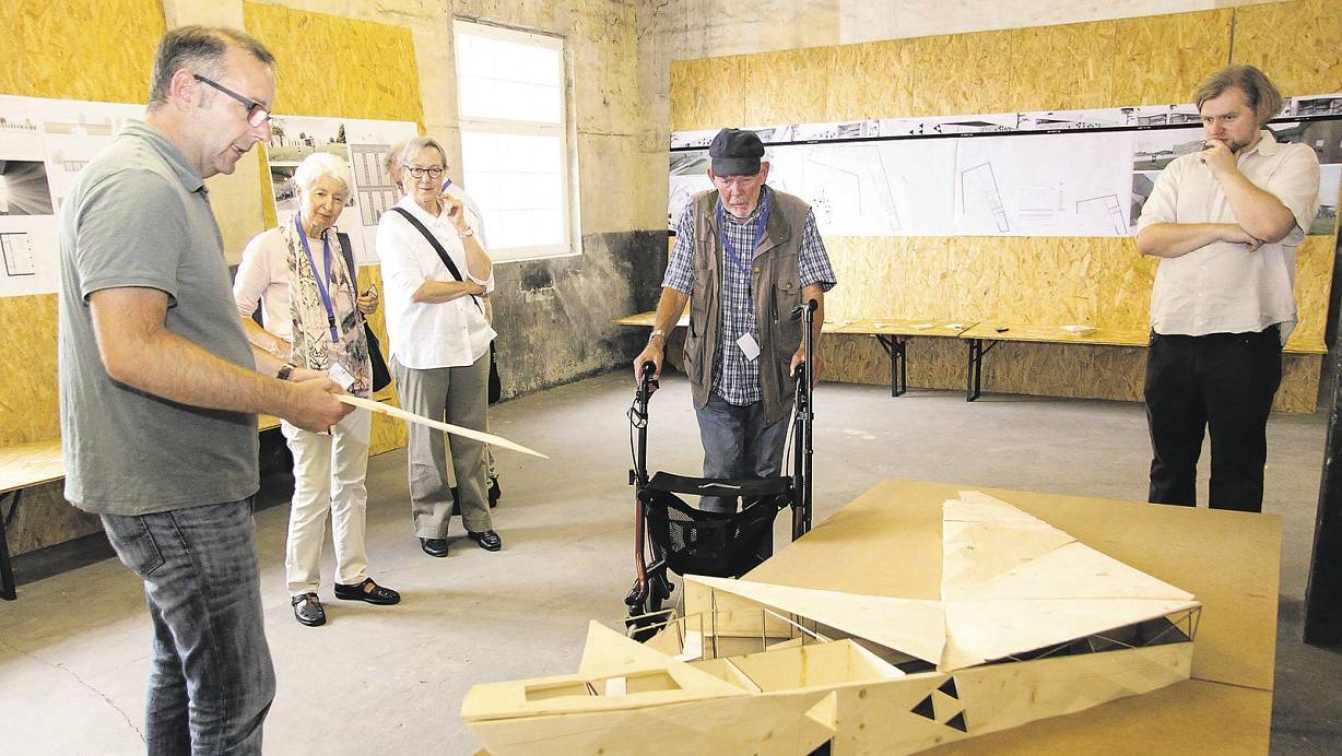 Eine Gruppe Besucher hat sich beim ersten von insgesamt drei Ausstellungsterminen die Ideen von Studierenden der Technischen Hochschule OWL für die künftige Gedenkstätte erklären und zeigen lassen.