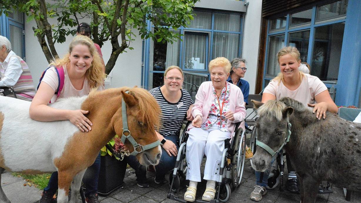 Zwei Mitarbeiterinnen bringen ihre Minishetlandponys zum Altenzentrum "Wiepeldoorn" mit. Sofort nehmen Bewohner und Tiere Kontakt miteinander auf
