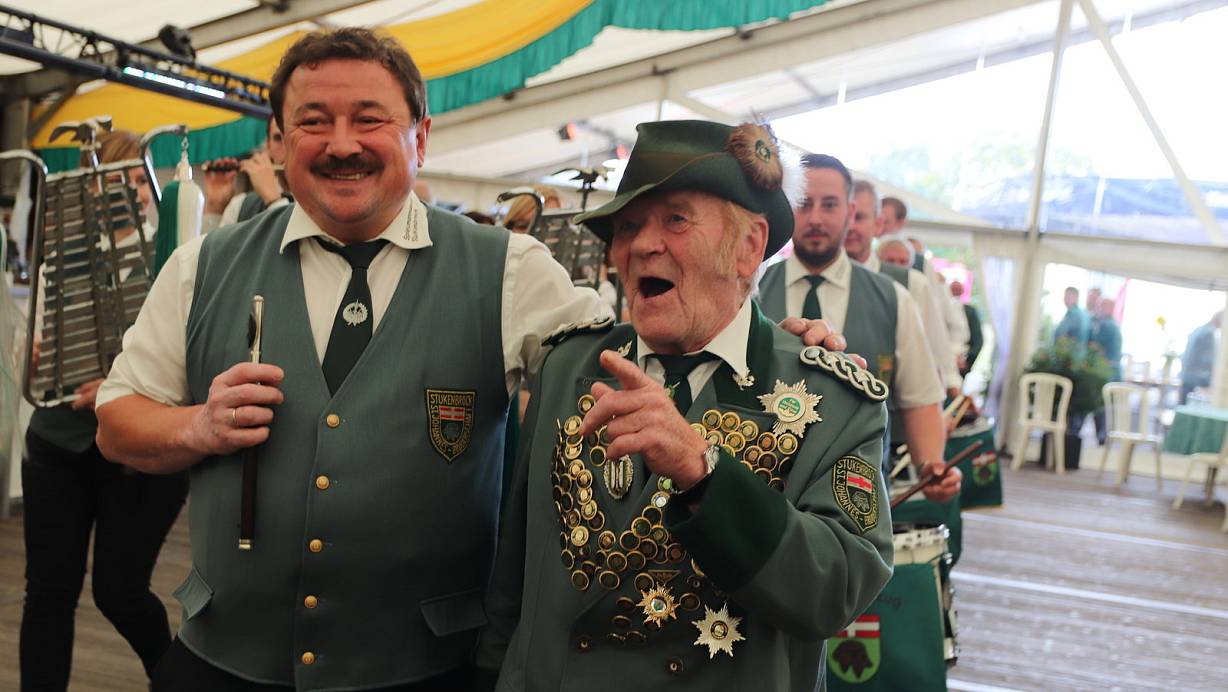 Ein Top-Schütze: Mit musikalischem Ehrengeleit des Spielmannszuges St. Johannes Stukenbrock wird Otto Fulland (r.) zum Podium eskortiert. Dirigent Norbert Greinert (links) freut sich mit ihm. | © Knut Dinter