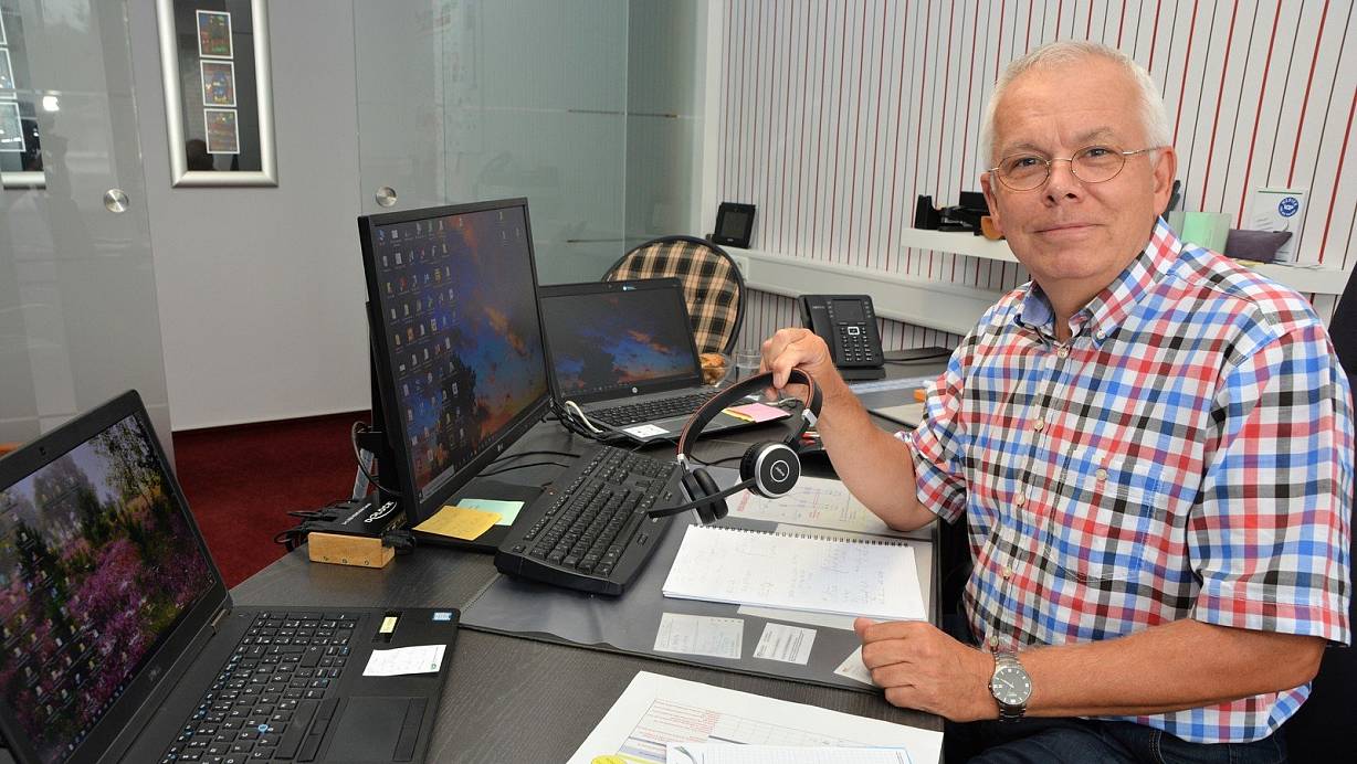 Fachmann: Drei Laptops stehen auf dem Schreibtisch von Hermann-Josef Brummelte. Sie werden beruflich, privat und für die Ehrenämter genutzt. Mit dabei ist ein Headset. Foto: Karin Prignitz | © Karin Prignitz