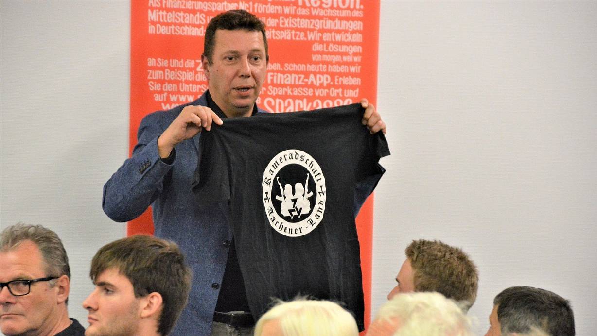 Thomas Pfeiffer zeigt anhand eines T-Shirts, welch versteckte Symbole heute von den Rechtsextremisten verwendet wird. „Immer einen Millimeter unter der Strafbarkeitsgrenze“. | © Karin Prignitz