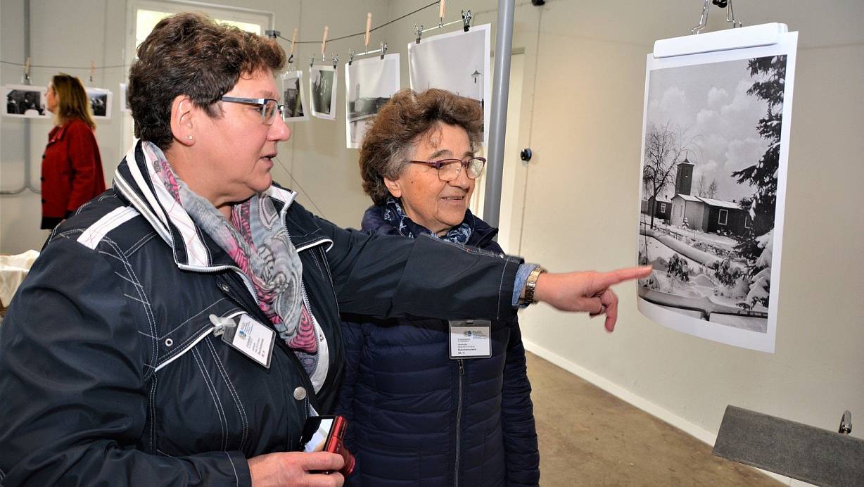 Erinnerungen: Auf den an Leinen hängenden alten Fotos erkennt Gertrud Riede (85) die Lagerkirche sofort wieder. Dort hat sie geheiratet. Mit ihrer älteren Tochter Brigitte Siek (67) und deren Mann ist die 85-Jährige gekommen. | © Karin Prignitz