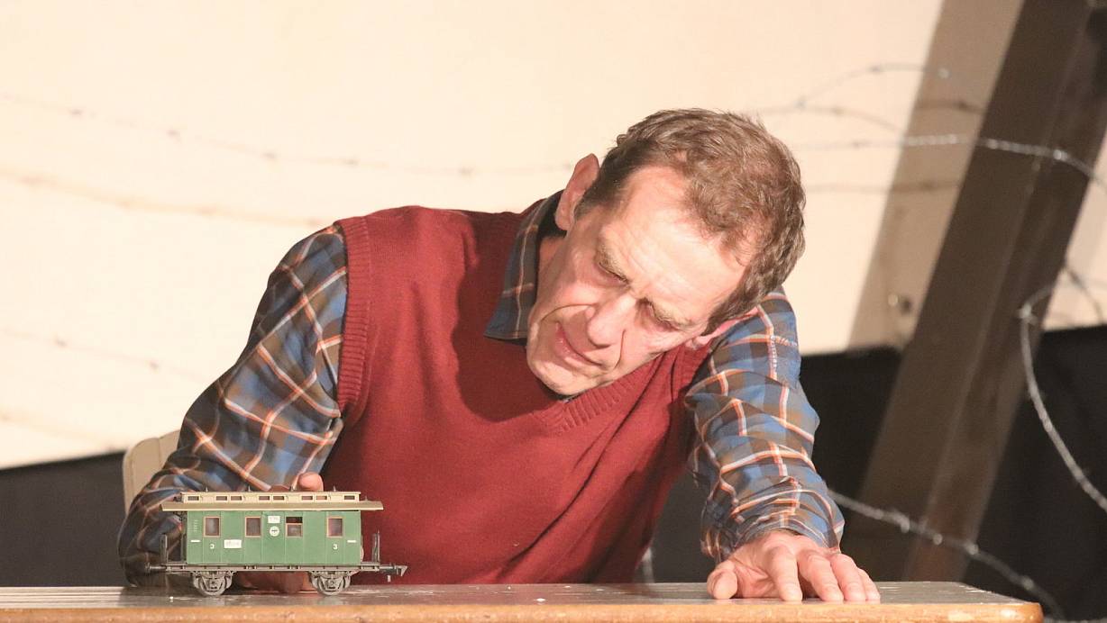 Karges Bühnenbild: Mit Gegenständen unterstützt Schauspieler Michael Grunert als Ferdinand Matuszek den Inhalt des Solostückes. Der Waggon spielt eine entscheidende Rolle im Leben des ehemaligen Zwangsarbeiters | © Sigurd Gringel