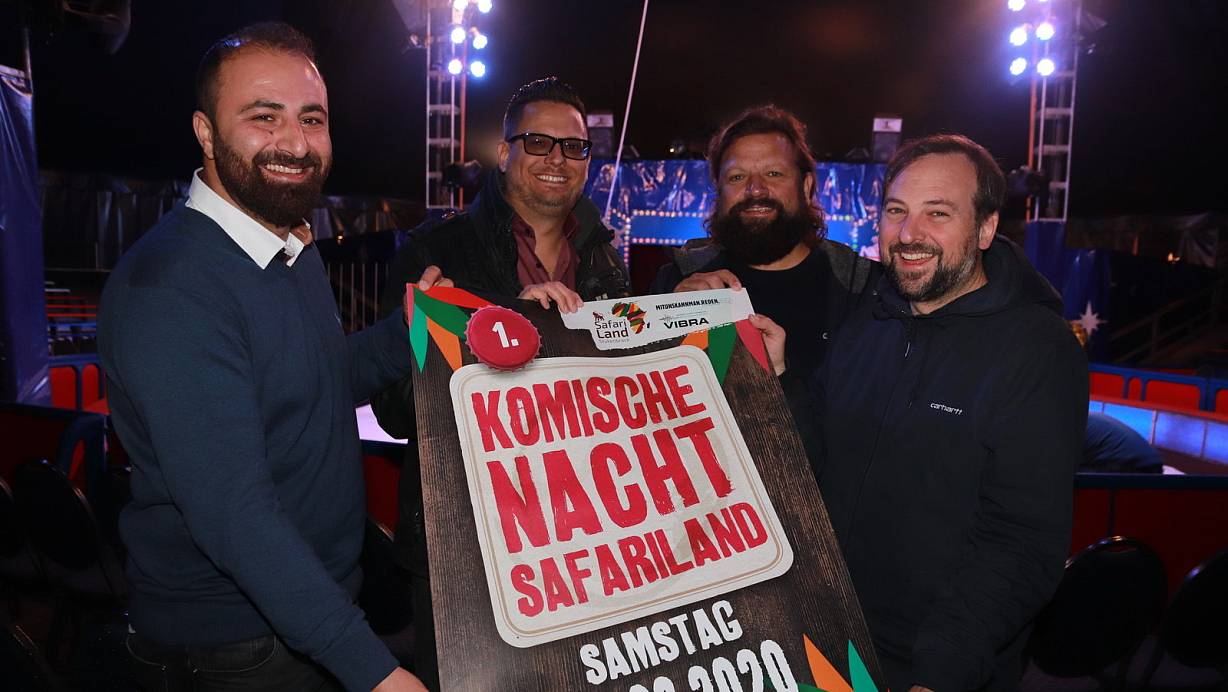 Gemeinschaftsleistung: Vahid Sanatjou (v. l.) und Frank Muschiol (Safariland), Walent-Tony Cerkez (Agentur Vibra) und Henrik Wächter (Agentur „Mitunskannmanreden“) bereiten die Komische Nacht vor. | © Knut Dinter