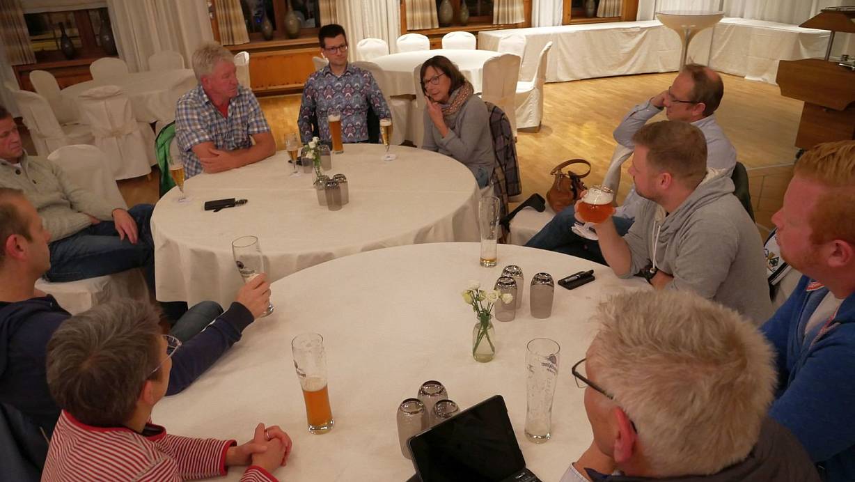 Diskussion beim Bier: Heike Boeckhaus (v. l.), Norbert Schirbel, Jens Oppitz, Susanna Stubbe, Bernd Eickelmann, Patrick Schweinforth, Grünensprecher Philipp Ashton und Udo Richter sprechen über aktuelle kommunale Themen im Gasthof „Zur Post". | © Kristoffer Fillies